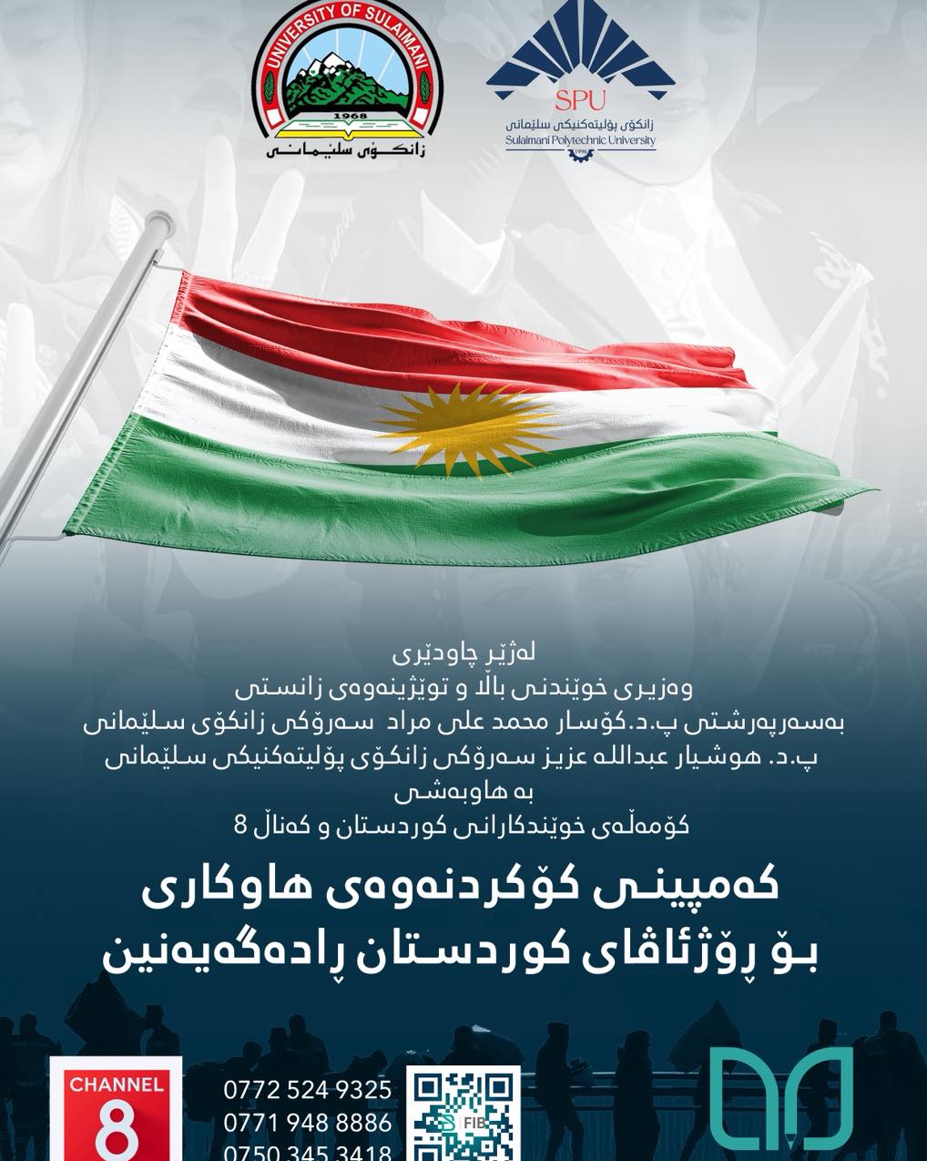 لەژێر چاودێری وەزیری خوێندنی باڵا و توێژینەوەی زانستی و بەسەرپەرشتی (د.کۆسار محەمەد عەلی) سەرۆکی زانکۆی سلێمانی و (پ.د.هۆشیار عەبدوڵڵا عەزیز) سەرۆکی زانکۆی پۆلیتەکنیکی سلێمانی، کۆمەڵەی خوێندکارانی کوردستان و کەناڵ 8، کەمپینێکی گەورە بۆ کۆکردنەوەی هاوکاری بۆ کوردانی ڕۆژئاڤا ڕادەگەیەنن.