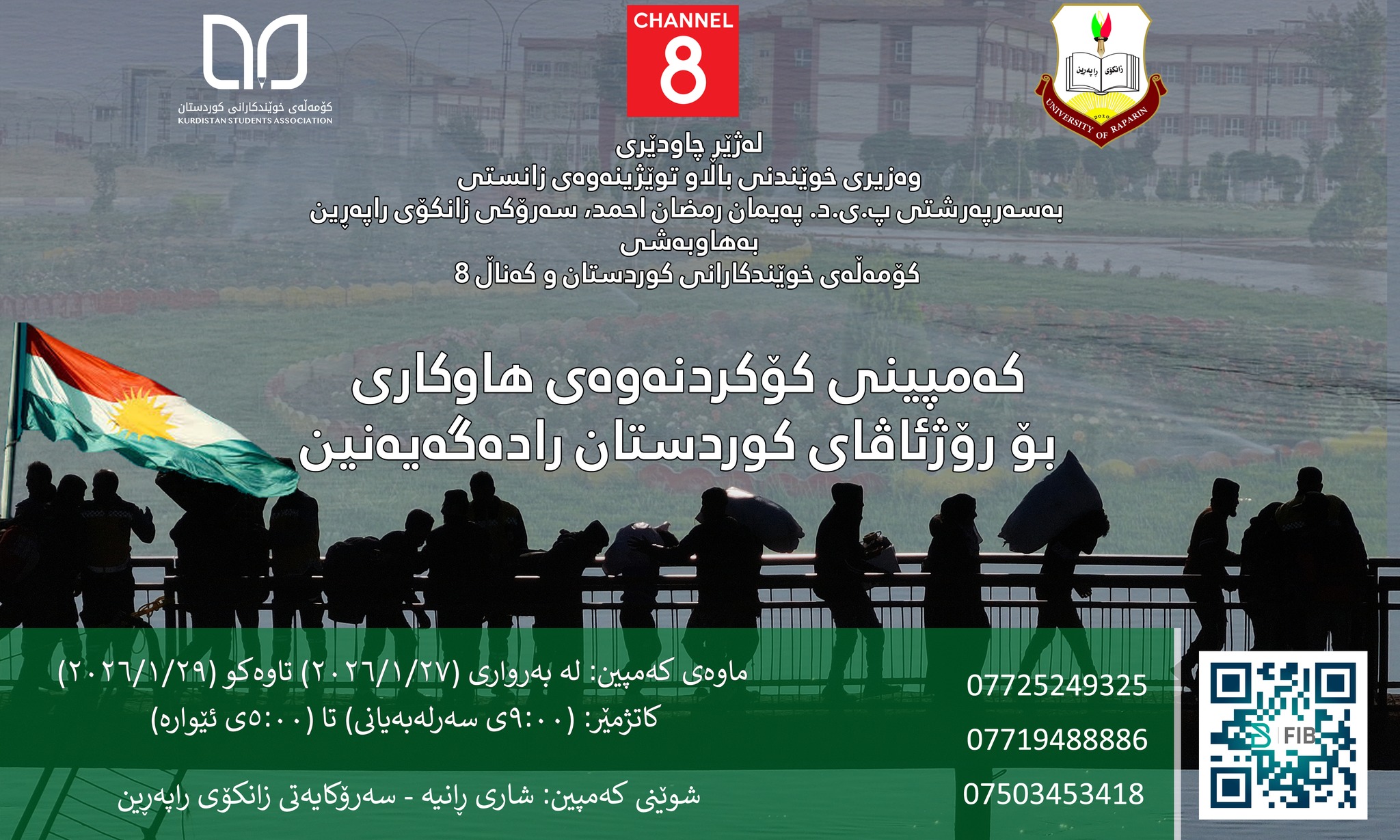 لەژێر چاودێری وەزیری خوێندنی باڵا و توێژینەوەی زانستی و بەسەرپەرشتی (پ.ی.د.پەیمان ڕەمەزان ئەحمەد) سەرۆکی زانکۆی ڕاپەڕین، کۆمەڵەی خوێندکارانی کوردستان و کەناڵ 8 (Channel 8)، کەمپینێکی گەورە بۆ کۆکردنەوەی هاوکاری بۆ کوردانی ڕۆژئاڤا ڕادەگەیەنن.