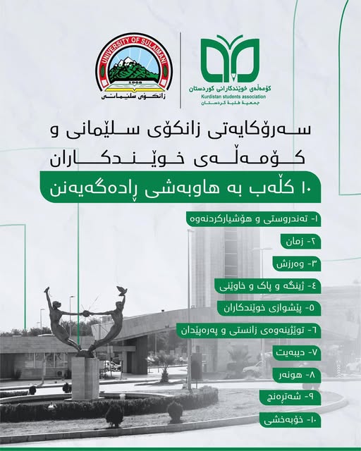 خوێندکارانی ئازیز ئاگاداردەکەینەوە کە دەتوانن لەڕێگەی ئەو تیمانەی کۆمەڵەی خوێندکاران دروستی کردوون و لەڕێگەی نوێنەری کۆلێج و بەشەکانەوە زانیاری تەواو لەسەر کڵەبەکان وەربگرن، کە وابڕیارە لە چەند ڕۆژی داهاتوودا فۆڕمێکی ئەلیکترۆنی ڕابگەیەنین و لەو ڕێگەیەوە خوێندکاران دەتوانن ناوی خۆیان تۆمار بکەن، بەمەبەستی بەشداربوون لە هەموو چالاکییەکانی نێو ئەم کڵەبانەدا.